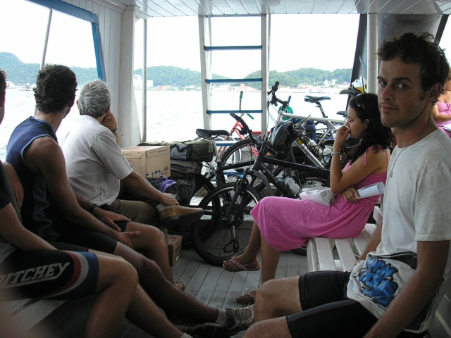Alguns autórgrafos depois, estávamos na estrada que da acesso à badalada ilha de São Francisco do Sul. Neste trecho, foram dois os pneus furados, e o tempo não se mostrava muito positivo para o nosso lado. Falando de outro tipo de tempo, aquele de relógio, não tinhámos muito e uma pequena confusão intra componentes foi gerada, até a opção de seguir para o centro histórico, tentando descobrir um jeito de trasladar até a "Vila da Glória", no extremo sul do município de Itapoá. Alguns minutos de negociação, e o barqueiro que opera a única linha, que é de passageiros, nos liberou uma preço legal para fazer a travessia.