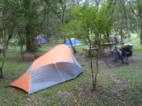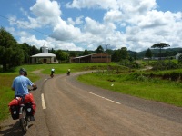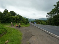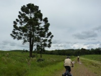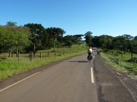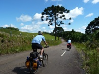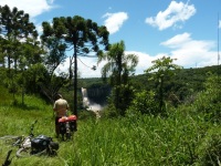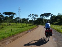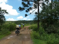 Um dia de poucas águas, com alguns riachos ao longo da estrada e o Salto da Fazenda Araúna ao longe. Ou melhor, nem tão poucas: a chuva gelada no final do dia e da estrada caiu como um balde de água fria. O plano, claro, era água de cachoeira e de caramanhola, nada mais. Mas a chuva vai e o ânimo vem. Paradinha no posto pra lavar as enlameadas bicicletas e desembarcar bonito na epicêntrica Guarapuava e lávamos nós: que água fria, que nada, a partir de amanhã é coqueluche de cachoeiras!