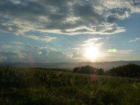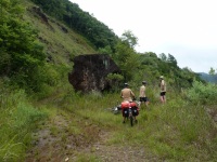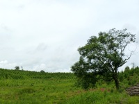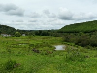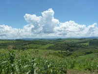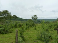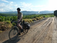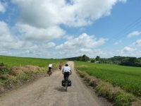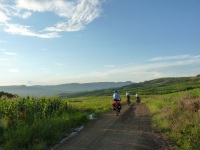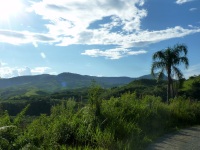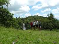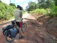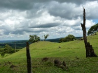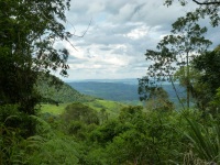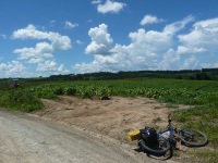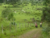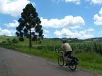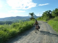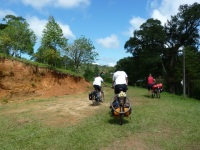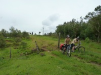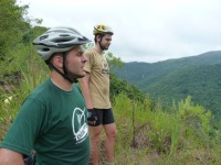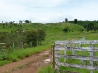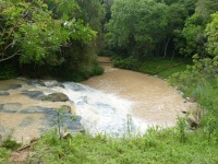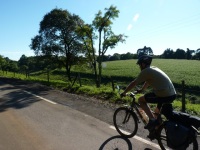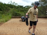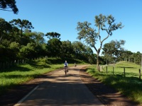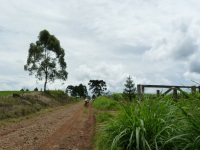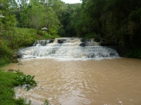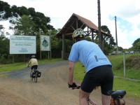 E isso, aclimatado leitor, somado ao fator sol-de-torrar, para acabar com qualquer resquício de reclamação de chuva. Queimadeira à parte, ainda tivemos uma baita sorte: chegamos na porteira no momento em que o proprietário, com a chave, saía. E de bicicleta! Boa, motivo suficiente para uma negociação e autorização para conhecer o Salto Sete. Por poucos instantes a mais teríamos comprado todas as subidas à toa. Tempo curto, fizemos uma rápida visita ao mirante e seguimos na esperança de uma recomposição alimentar na “Vila Ucraniana” marcada no mapa.