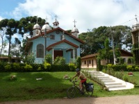a igreja nossa senhora da conceição, tipicamente ucraniana, com um ciclista tipicamente odois na frente